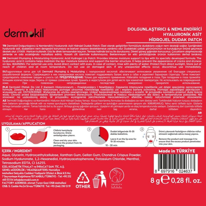 استمتعي بشفاه ممتلئة وناعمة مع هذا الماسك المتطور بتقنية الهيدروجيل. تجمع تركيبته الفريدة بين حمض الهيالورونيك الذي يحافظ على توازن الرطوبة ويقوي حاجز البشرة، والجلسرين الذي يضمن مرونة ونعومة تدوم طويلاً. يعمل المنثول بلمسته المنعشة على تحفيز تدفق الدم، مما يمنح الشفاه حيوية وامتلاءً طبيعياً. هذا الماسك هو الحل المثالي للتخلص من المظهر الباهت والجفاف، لتبدو شفاهك أكثر جاذبية ونعومة.