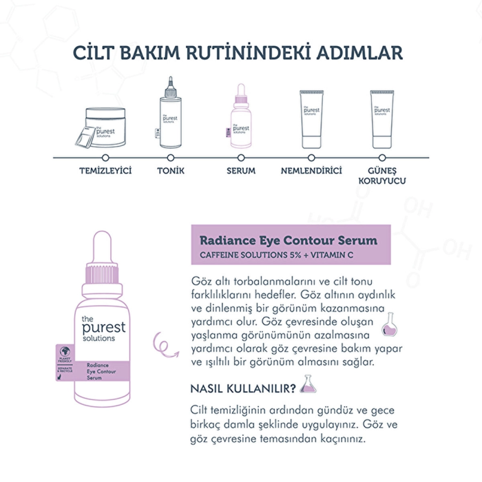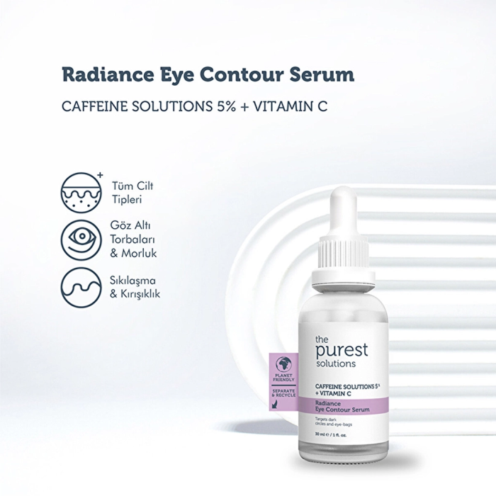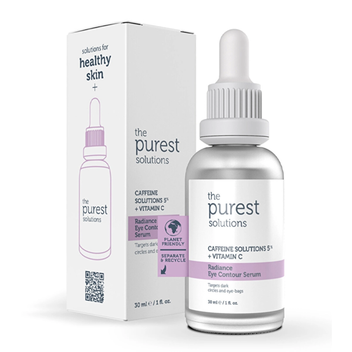 سيروم العناية بالعين من ذا بيورست سوليوشنز هو الحل المتكامل لمظهر عيون متعب. بتركيز عالٍ من الكافيين (5%)، يعمل السيروم على تحسين الدورة الدموية الدقيقة حول العين لتقليل الانتفاخات بشكل فوري. كما يحتوي على مشتق مستقر من فيتامين C (Ethyl Ascorbic Acid) الذي يستهدف التصبغات والهالات السوداء، مما يترك منطقة تحت العين أكثر إشراقاً ونعومة وشباباً.